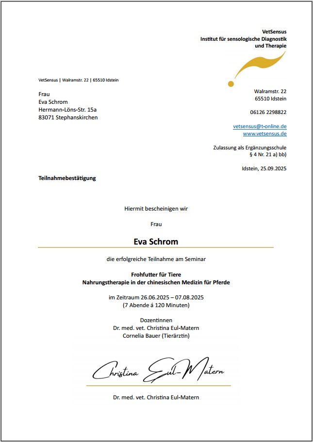 Durch meine Promotion in Biomedizin sind für mich Tierarztbefunde keine Dokumente auf Fachchinesisch, sondern ermöglichen mir, mir schnell ein Bild der Lage zu machen und darauf aufbauend am besten und gerne in Abstimmung mit dem Tierarzt einen Trainings- oder Rehaplan zu erstellen. Wichtig dabei sind mir vor allem der langfristige Erfolg und dafür integriere ich gerne auch bewährte Methoden außerhalb der Schulmedizin, wie beispielsweise Elemente der traditionellen chinesischen Medizin.